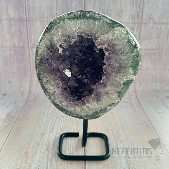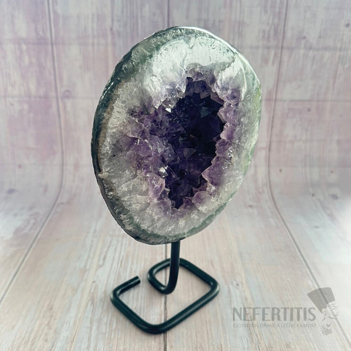 Amethyst-Druse der Qualität A auf einem Metallständer.