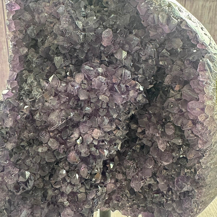 Amethyst-Druse der Qualität A auf einem Metallständer. Sie kaufen genau das abgebildete Stück. Der Ständer kann Flecken hinterlassen, daher empfehlen wir, eine Matte darunter zu legen und ihn nicht direkt auf Möbel zu… Mehr lesen »