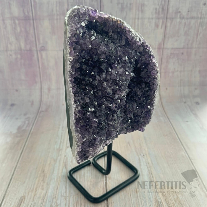 Amethyst-Druse der Qualität A auf einem Metallständer.
