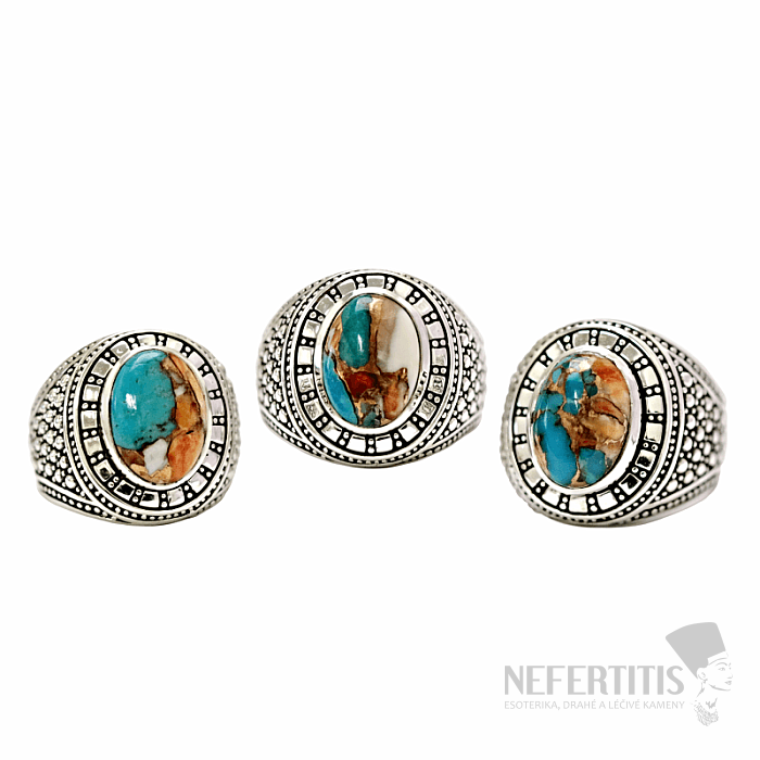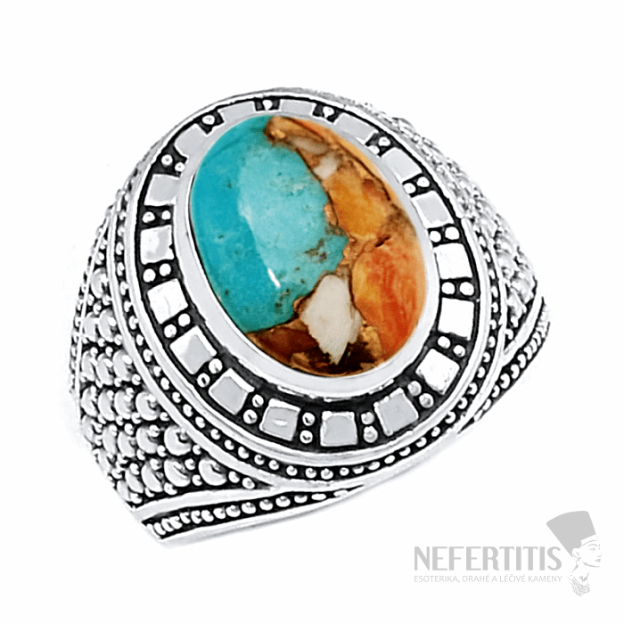 Dieser massive Herrenring aus Silber ist ein präzise handgefertigtes Schmuckstück, das traditionelle Verzierungen mit modernen Materialien verbindet. Er besteht aus 925/1000 Sterlingsilber und ist mit einem ovalen Cabochon aus Spiny Oyster-Türkis (ca. 15 mm) besetzt. Das Gewicht des Rings beträgt ca. 12 g , was ihm Ausdruckskraft, Stärke und ein Gefühl von Luxus verleiht. Illustratives Bild.