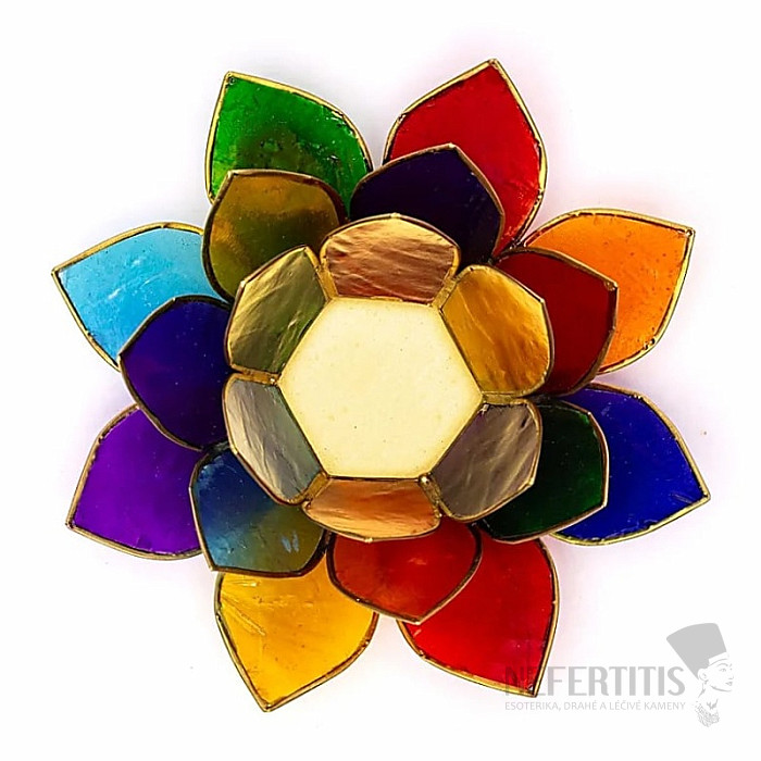 Chakra-Kerzenhalter in Form einer Lotusblume zur Harmonisierung der sieben Chakren. Der Kerzenhalter ist aus Austernschalen (Placuna placenta), auch bekannt als Capiz-Muscheln, gefertigt. Der Name leitet sich von der Region um Panay City in der Provinz Capiz auf den Philippinen ab. Nach der Reinigung sind die Schalen von Natur aus durchscheinend und werden anschließend gefärbt, wodurch ein wunderschönes Farben- und Lichtspiel entsteht.