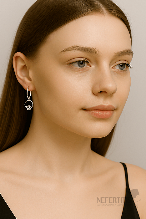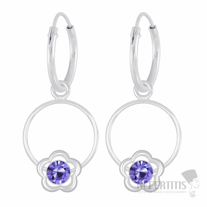 Zeitlose Silberohrringe mit einer Länge von 2,6 cm bestechen durch ihr originelles Design, das aus zwei zarten Kreisen mit einer Dicke von 1,2 mm besteht, mit einem blumenförmigen Anhänger mit Zirkonia in der Farbe eines wunderschönen blauen Tansanits . Die Kristalle verleihen dem Schmuck einen luxuriösen Touch und ein elegantes Funkeln , das jedes Outfit aufpeppt.