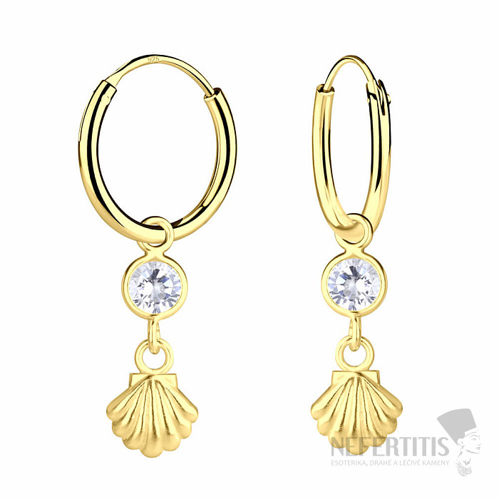 Zeitlose vergoldete Silberohrringe mit Zirkon, 2,5 cm lang, bestechen durch ihr originelles Design, das aus einem Kreis mit 1,2 cm Durchmesser und 1,2 mm Dicke mit einem muschelförmigen Anhänger besteht. Die Muschel symbolisiert allgemein Schutz, Weiblichkeit/Fruchtbarkeit, Geburt und Reise. Die Ohrringe sind vom Typ Huggie. Huggie-Ohrringe sind kleine runde Ohrringe, die das Ohrläppchen eng umschließen und dank des Schnappringverschlusses (Scharnier) den ganzen Tag bequem zu tragen sind.