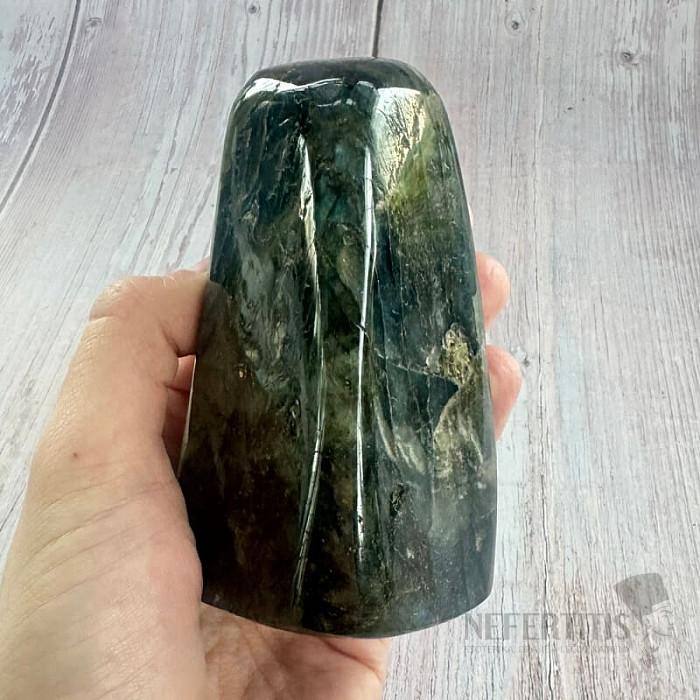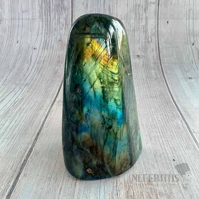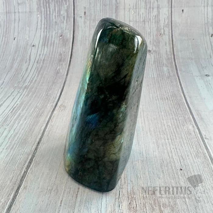 Ein wunderschöner, frei geformter, handpolierter, schillernder Labradorit mit einem auffälligen Farbspiel, der bei Lichteinfall magisch leuchtend blau leuchtet. Dekorative Freiform in ausgesuchter Qualität.