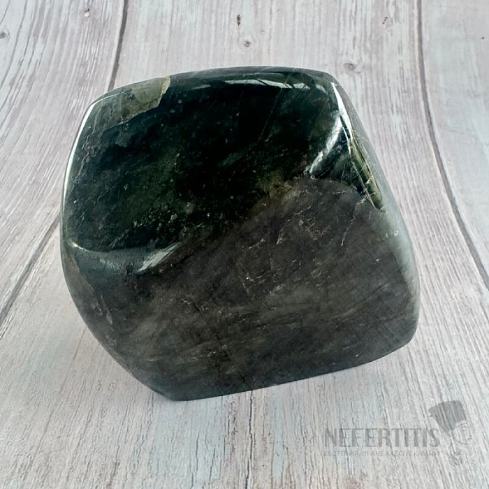 Ein wunderschöner, frei geformter, handpolierter, schillernder Labradorit mit einem auffälligen Farbspiel, der bei Lichteinfall magisch leuchtend blau leuchtet. Dekorative Freiform in ausgesuchter Qualität.