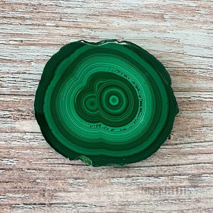 Eine polierte, geglättete Malachitscheibe mit einem sehr schönen und deutlichen Muster, beidseitig geglättet mit feinem Glanz. Sie kaufen hier ein direkt abgebildetes Stück Malachit.