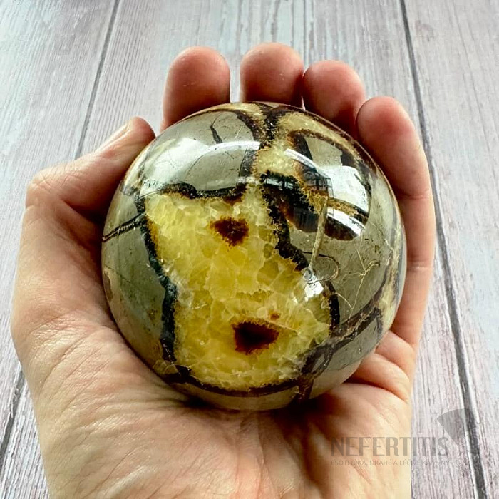 Septaria (auch als Drachenstein bekannt) besteht aus kleinen Kristallen aus Calcit, Aragonit und Chalcedon . Es vereint die Eigenschaften aller Mineralien, aus denen es besteht, und ist damit ein Stein mit äußerst kraftvoller Wirkung. Es bietet starken Energieschutz sowohl auf der physischen, mentalen als auch auf der ätherischen Ebene. Es strahlt eine beruhigende Energie um sich herum aus. Es ist ein ausgezeichneter Verbündeter beim Lernen. Es hilft seinem Besitzer bei der Motivation und anschließend bei der Umsetzung neuer Gedanken und Ideen in die Praxis. Es entwickelt sich positiv zu einer Karriere, insbesondere im Zusammenhang mit öffentlichen Reden. Stimuliert das Basis-Wurzel-Chakra. Es bringt ein erhebendes Gefühl von Freude und innerer Entwicklung.