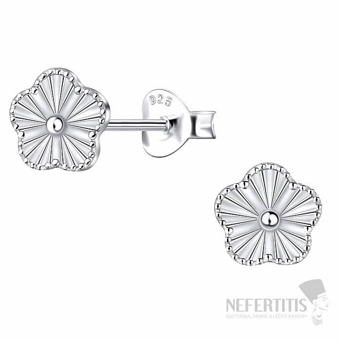 Das dominierende Element ist eine stilisierte Blüte mit einer strahlenförmigen Oberflächenstruktur, die das Licht wunderschön reflektiert und den Ohrringen einen sanften, natürlichen Glanz verleiht. Der Blütenrand ist mit winzigen Kugeln verziert, die die Detailgenauigkeit und Eleganz des gesamten Designs unterstreichen.