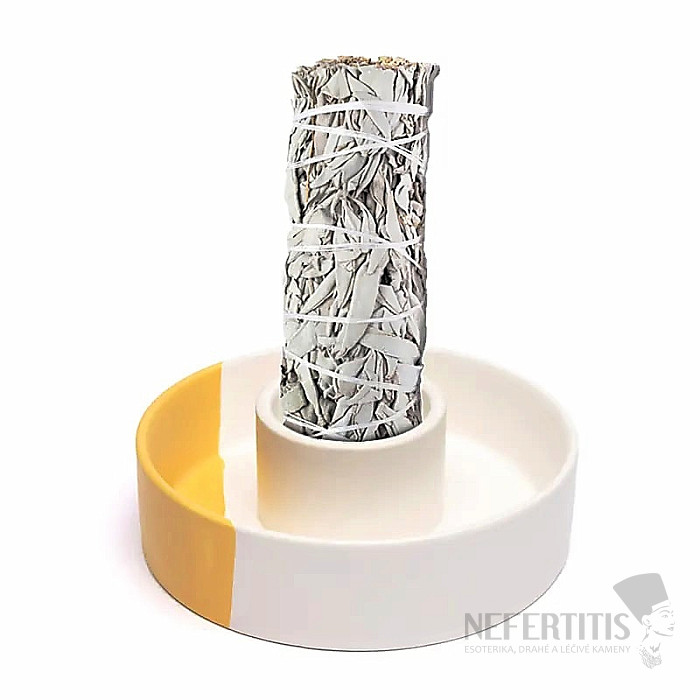 Dieser runde , ockerfarbene Keramikständer ist ein handgefertigtes und robustes Accessoire, das speziell für das sichere Verbrennen von Räucherbündeln entwickelt wurde. Er besteht aus hochwertiger, hochgebrannter Keramik, was hohe Hitzebeständigkeit, Stabilität und Langlebigkeit garantiert. Der Ständer hat eine elegante, runde Form und fängt die Überreste brennender Kräuter sicher auf. Die ockerfarbene Glasur verleiht ihm einen natürlichen, warmen und erdigen Charakter. Jedes Stück ist ein Unikat – leichte Abweichungen in Farbton, Struktur und Muster sind das Ergebnis sorgfältiger Handarbeit. Material: Keramik. Abbildung beispielhaft.