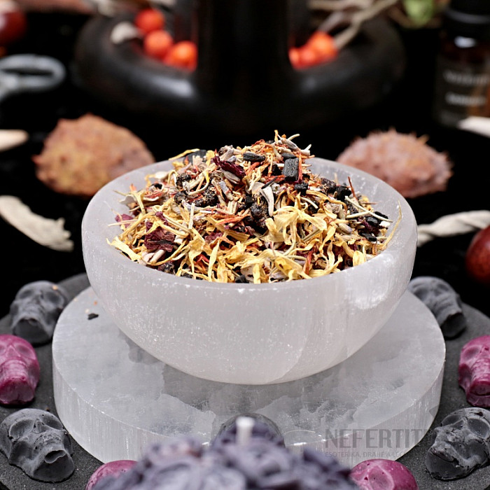 Samhain-Räuchermischung – die Grenze zwischen den Welten und die Feier der Vorfahren, die wir in unserer Zauberwerkstatt in Nefertitis für Sie erfunden und gemischt haben, auf eine Weise, die die traditionellen Kräuter respektiert, die während dieses magischen Feiertags verwendet werden. Feiern Sie den 7. Feiertag des Jahreskreises, der in die Nacht vom 31. Oktober auf den 1. November fällt. Die Mischung enthält Harz, heiliges Holz, Lavendel, Rosmarin und andere Zutaten. Gewicht 20 g.