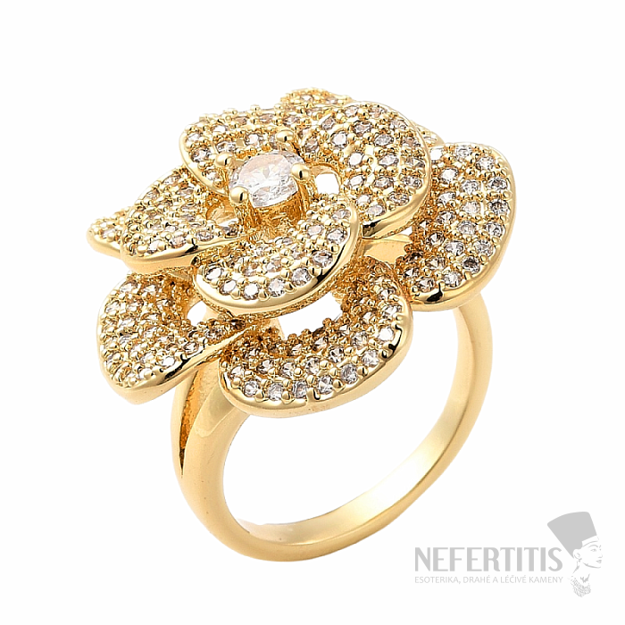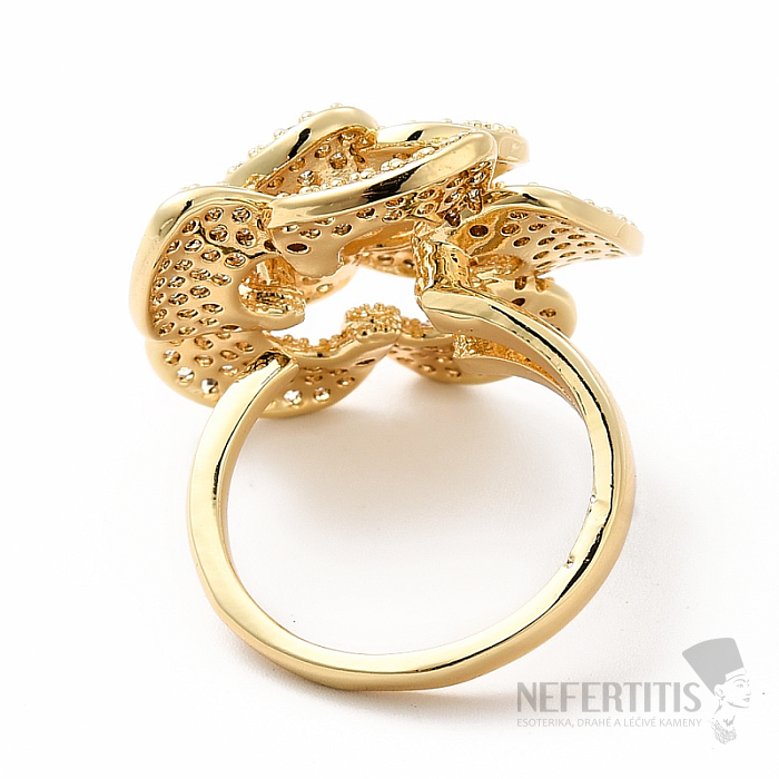 Das florale Motiv gilt seit der Antike als Symbol für Weiblichkeit, Liebe und Erneuerung. Die große Blume auf dem Ring drückt Lebensfülle, Freude und natürlichen Charme aus. Die Kombination aus vergoldeter Oberfläche und strahlenden Steinen schafft ein Schmuckstück, das nicht nur schön, sondern auch symbolträchtig ist.