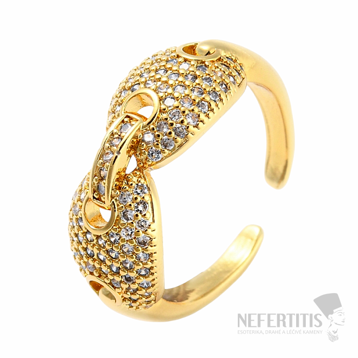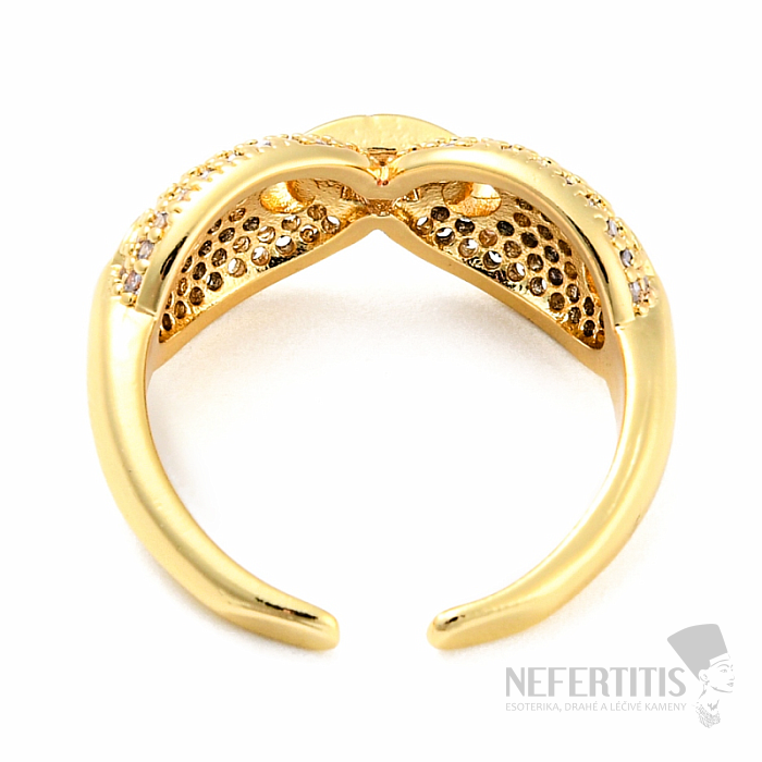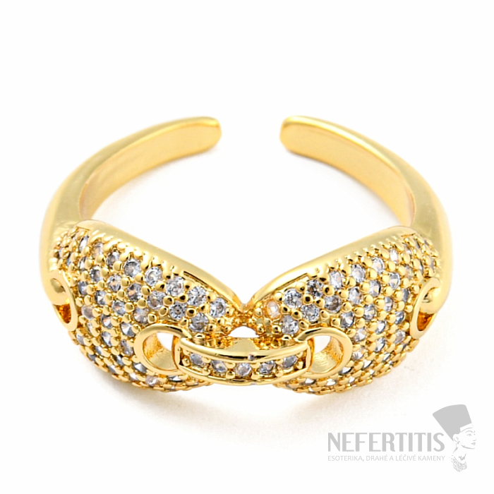 Eleganter vergoldeter Damenring Bow. Gönnen Sie sich ein Schmuckstück, das nie aus der Mode kommt. Dieser Damenring mit Zirkonia ist aus Messing gefertigt und mit einer zarten vergoldeten Oberfläche verziert , die dem Schmuckstück ein luxuriöses Aussehen verleiht. Dank Dutzender Zirkonia funkelt er wunderschön. Das elegante Design unterstreicht Ihr Alltagsoutfit und passt auch hervorragend zu Abendkleidern oder festlichen Anlässen. Dank seines universellen Stils ist dieser vergoldete Ring ein ideales Geschenk für Ihre Partnerin, Mutter oder Freundin. Er lässt sich wunderbar mit anderem vergoldeten Schmuck kombinieren – Ohrringen, Kette oder Armband. Material: Messing vergoldet mit 18 Karat Gold, Zirkonia, Ringbreite: ca. 8,6 mm. Illustratives Bild.