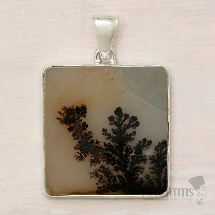 Außergewöhnlicher und wunderschön gearbeiteter Anhänger aus seltenem dendritischen Achat in Silber. Das Schmuckstück weist anmutige „Büsche“ in Braun-Schwarz und Gelb auf. So gefärbte Stücke, die wie echte Büsche aussehen, sind selten. Ein zartes und dennoch unverwechselbares Schmuckstück dank der Steinstruktur. Ag 925. Sie erwerben das abgebildete Schmuckstück.