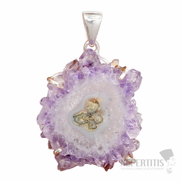 Exklusiver, bezaubernder Silberanhänger aus dem polierten Kern eines seltenen Amethyst-Stalaktiten – ein Stalaktit, der sich über Millionen von Jahren tief in einer Höhle gebildet hat und dessen Entstehung durch den ersten Tropfen Mineralwasser ausgelöst wurde. Silber 925. Die beidseitig polierten Scheiben des Amethyst-Stalaktiten symbolisieren inneres Wachstum, Neuanfänge und die Stärkung des höheren Selbst. Ihr ungewöhnliches Aussehen, das an die Blütenblätter zarter violetter Astern erinnert, macht dieses Schmuckstück besonders schön. Sie erwerben genau das abgebildete Schmuckstück.