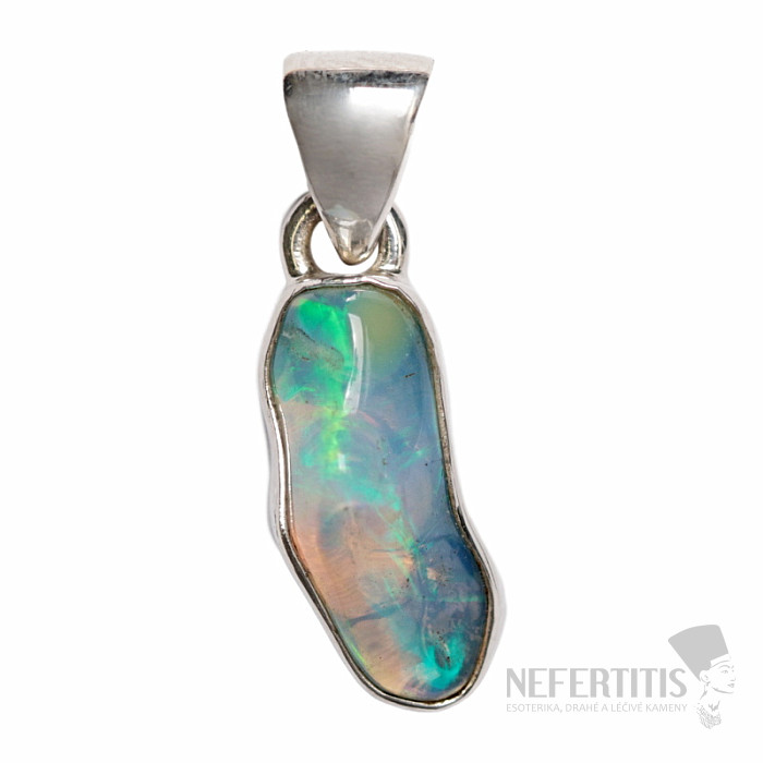 Moderner und eleganter Silberanhänger mit roh poliertem Opal, der ein wunderschönes Farbenspiel entfaltet. Silber 925. Ein beeindruckendes und elegantes Schmuckstück, das schon beim Anblick Freude und Harmonie ausstrahlt. Äthiopische Opale, im Gegensatz zu australischen Opalen, schimmern in leuchtenden Farben. Auch wenn es auf den ersten Blick nicht ersichtlich ist, wird das Farbenfeuerwerk, das der Opal in diesem Anhänger bei jedem Lichteinfall entfacht, nicht nur Sie, sondern Ihre gesamte Umgebung verzaubern. Sie erwerben das abgebildete Schmuckstück.