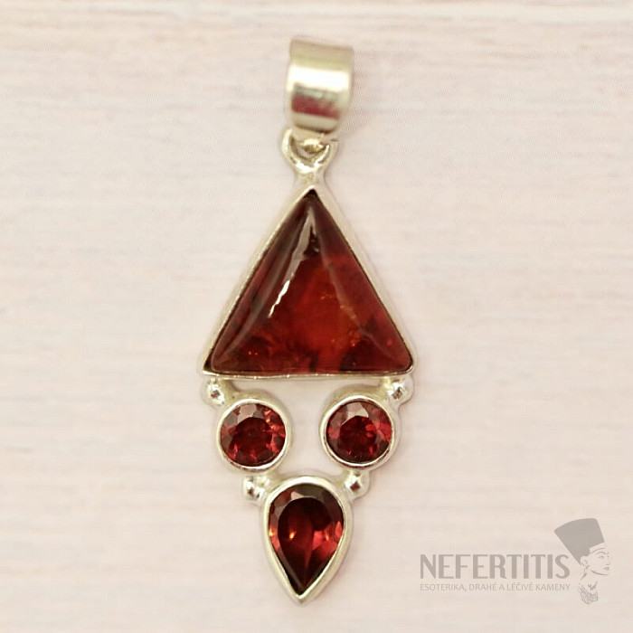 Silberanhänger mit wunderschönem honigfarbenem baltischen Bernstein und geschliffenen Granaten. Ag 925. Ein unverwechselbarer und wahrer Blickfang. Sie erwerben genau das abgebildete Schmuckstück.