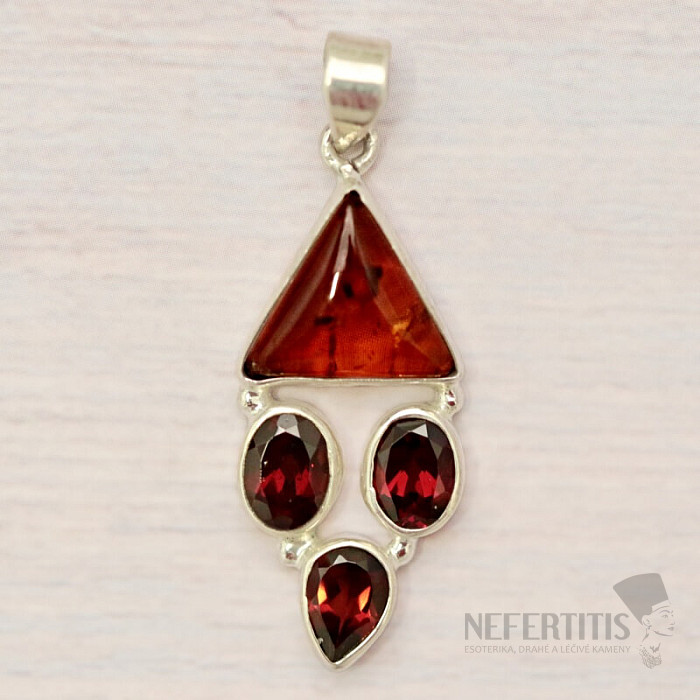 Silberanhänger mit wunderschönem honigfarbenem baltischen Bernstein und geschliffenen Granaten. Ag 925. Ein unverwechselbarer und wahrer Blickfang. Sie erwerben genau das abgebildete Schmuckstück.