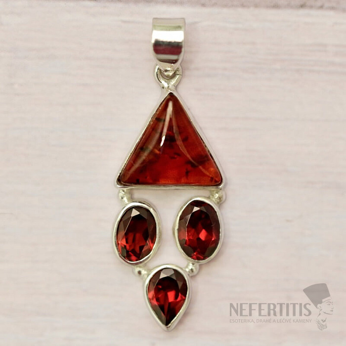 Silberanhänger mit wunderschönem honigfarbenem baltischen Bernstein und geschliffenen Granaten. 925er Silber. Ein unverwechselbarer und wahrer Blickfang. Sie erwerben genau das abgebildete Schmuckstück.