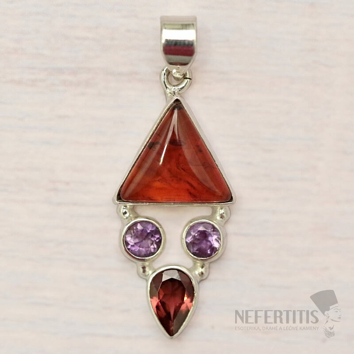 Silberanhänger mit wunderschönem honigfarbenem baltischen Bernstein, geschliffenen Amethysten und geschliffenem Granat. Ag 925. Ein auffälliger und wahrer Blickfang. Sie kaufen genau das abgebildete Schmuckstück.