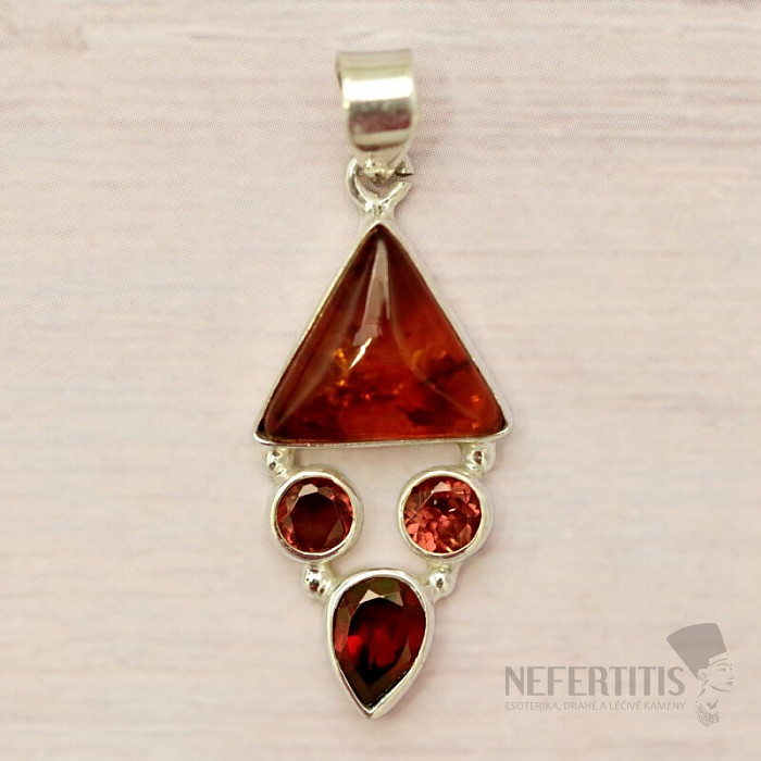 Silberanhänger mit wunderschönem honigfarbenem baltischen Bernstein und geschliffenen Granaten. 925er Silber. Ein unverwechselbarer und wahrer Blickfang. Sie erwerben genau das abgebildete Schmuckstück.