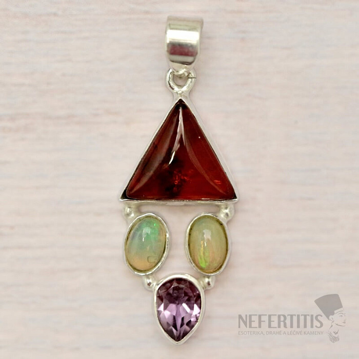 Silberanhänger mit wunderschönem honigfarbenem baltischen Bernstein, äthiopischen Opalen und geschliffenem Amethyst. 925er Silber. Ein auffälliger und echter Hingucker. Sie erwerben genau das abgebildete Schmuckstück.