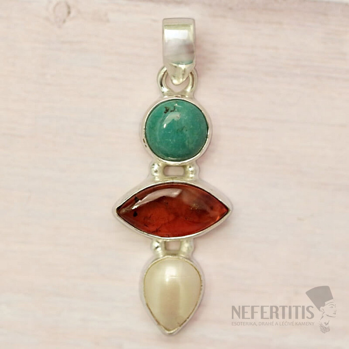 Silberanhänger mit wunderschönem honigfarbenem baltischen Bernstein, Türkis und Perle. 925er Silber. Ein unverwechselbarer und echter Hingucker. Sie kaufen genau das abgebildete Schmuckstück.