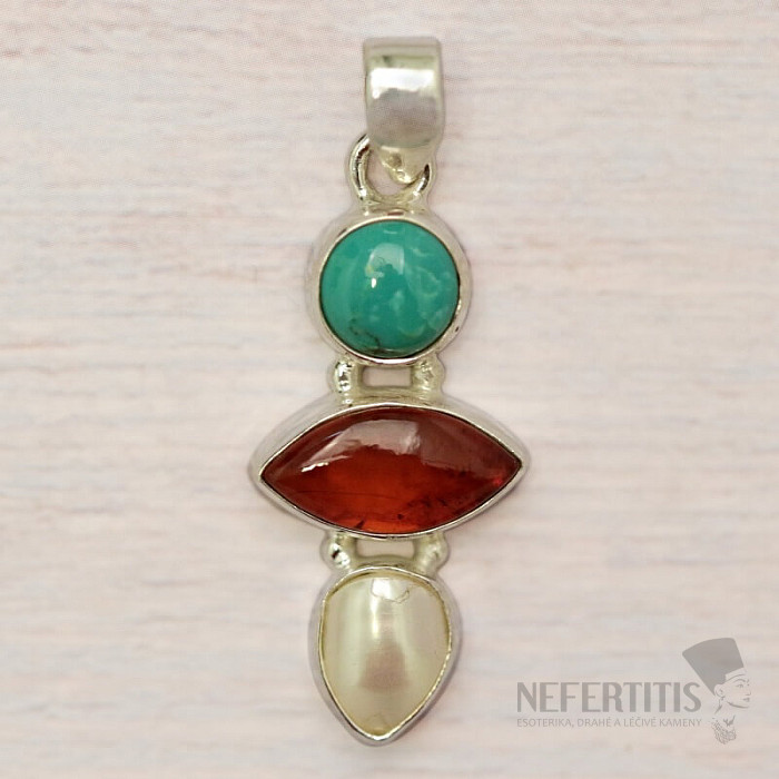 Silberanhänger mit wunderschönem honigfarbenem baltischen Bernstein, Türkis und Perle. 925er Silber. Ein unverwechselbarer und echter Hingucker. Sie kaufen genau das abgebildete Schmuckstück.