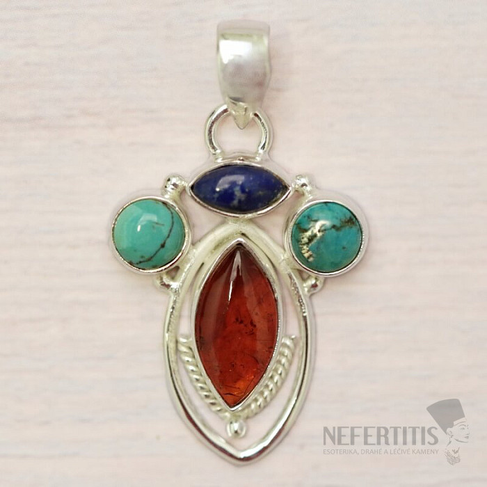 Silberanhänger mit wunderschönem honigfarbenem baltischen Bernstein, Türkis und Lapislazuli. 925er Silber. Ein unverwechselbarer und echter Hingucker. Sie kaufen genau das abgebildete Schmuckstück.