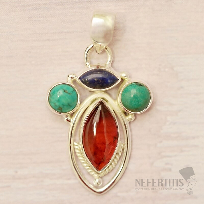 Silberanhänger mit wunderschönem honigfarbenem baltischen Bernstein, Türkis und Lapislazuli. 925er Silber. Ein unverwechselbarer und echter Hingucker. Sie kaufen genau das abgebildete Schmuckstück.
