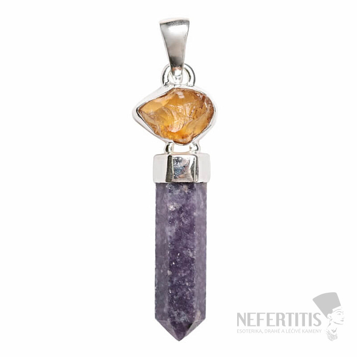 Wunderschöner silberner Designeranhänger mit Lepidolithkristall und rohem Citrin. Ag 925. Sie erwerben direkt den abgebildeten Schmuck.