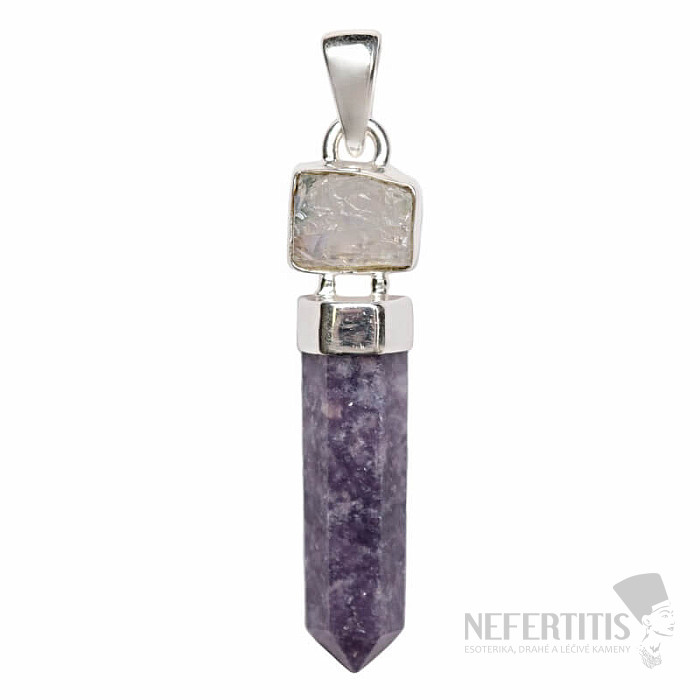 Wunderschöner silberner Designeranhänger mit Lepidolithkristall und rohem Mondstein. Ag 925. Sie erwerben direkt den abgebildeten Schmuck.