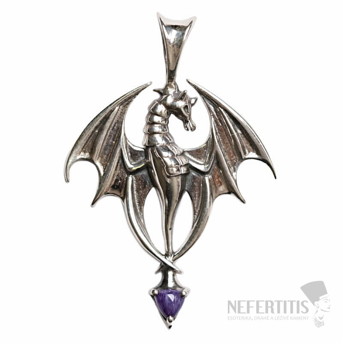 Wunderschöner Designer-Anhänger aus Silber in Drachenform mit Charoit . Der wunderschöne violette Charoit wird Sie nicht nur mit seinem seidigen Glanz, sondern auch mit dem faszinierenden Farbwechsel des Motivs im wechselnden Licht verzaubern. Silber 925. Sie erwerben direkt das abgebildete Schmuckstück.