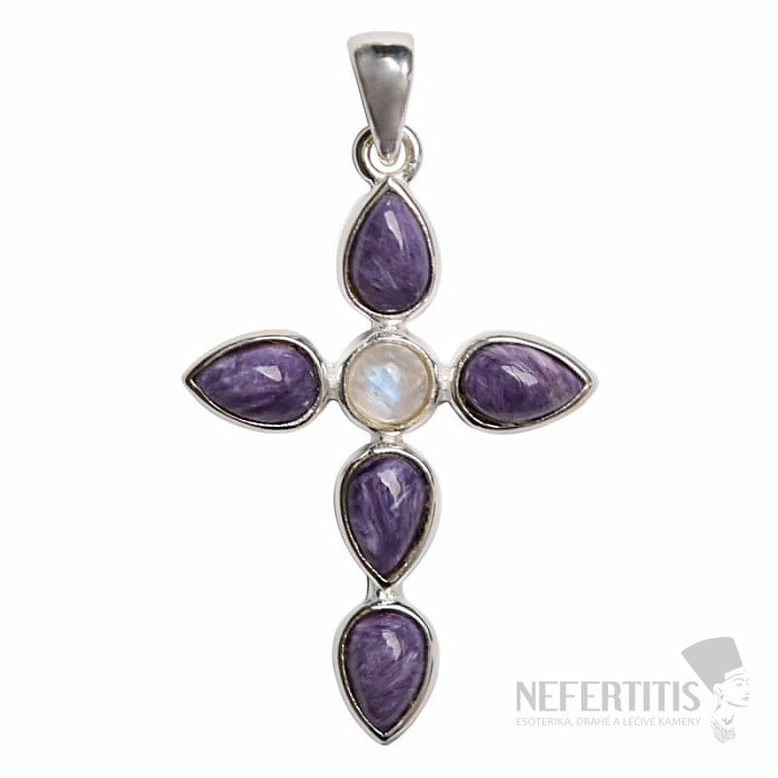 Wunderschöner Designer-Anhänger aus Silber in Kreuzform mit Charoit und Mondstein . Der wunderschöne violette Charoit wird Sie nicht nur mit seinem seidigen Glanz verzaubern, sondern auch mit dem faszinierenden Farbwechsel des Motivs im wechselnden Licht. Silber 925. Sie erwerben das abgebildete Schmuckstück.