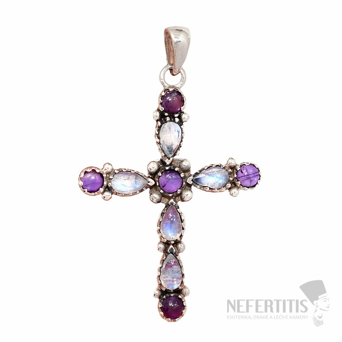 Wunderschöner Designer-Anhänger aus Silber mit Regenbogenmondstein und Amethyst. 925er Silber. Ein atemberaubendes Schmuckstück, das alle Blicke auf sich zieht und an Ihnen garantiert alle Blicke auf sich zieht. Sie erwerben genau das abgebildete Schmuckstück.
