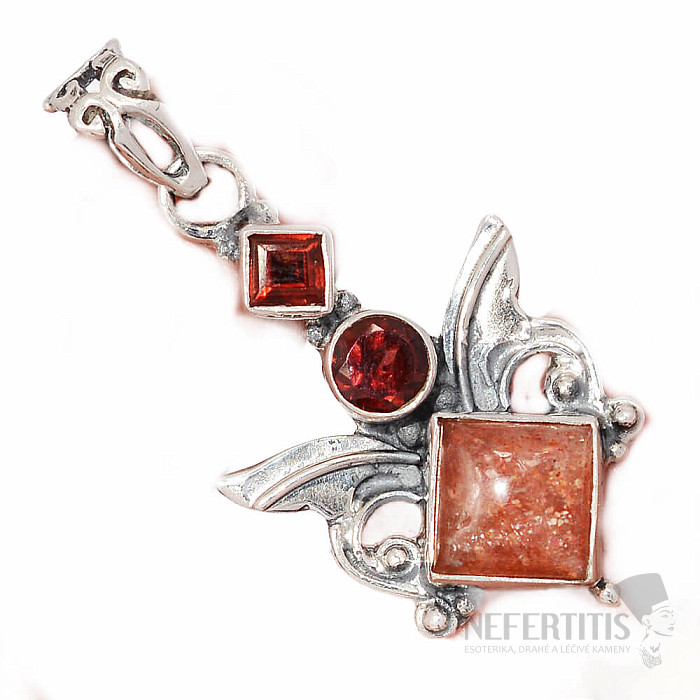 Wunderschöner Designer-Anhänger aus Silber mit Sonnenstein und geschliffenen Granaten. Silber 925. Die wunderschöne orange Farbe des Sonnensteins bringt Freude ins Leben und symbolisiert Freundschaft, Vergnügen und familiären Zusammenhalt. Sie erwerben das abgebildete Schmuckstück.