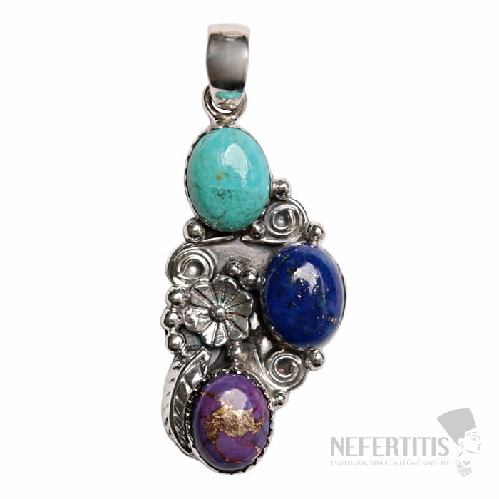 Wunderschöner Designer-Anhänger aus Silber mit Stücken von natürlichem, gefärbtem Türkis , die mit Kupfer zu beeindruckenden Cabochons in wunderschönen violetten und blauen Farbtönen verbunden sind, sowie Lapislazuli. Diese Art von Schmuck erfreut sich weltweit zunehmender Beliebtheit, da die Preise für massiven, natürlichen Türkis stetig steigen. So gefertigte Cabochons sind heutzutage eine der wenigen Möglichkeiten, Schmuck mit natürlichem Türkis zu einem relativ erschwinglichen Preis zu erwerben. Silber 925. Sie kaufen den abgebildeten Schmuck.