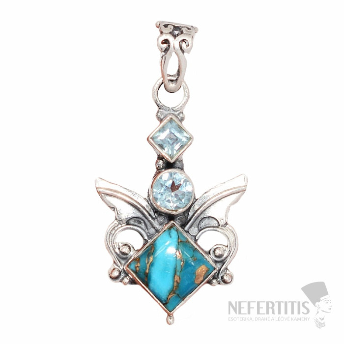 Wunderschöner Designer-Anhänger aus Silber mit Türkisstücken , die durch Kupfer zu einem blauen Cabochon verbunden sind, und geschliffenen Topasen. Silber 925. Diese Art von Schmuck erfreut sich weltweit zunehmender Beliebtheit, da die Preise für massiven, natürlichen Türkis stetig steigen. Türkis in Schmuckstücken soll Glück bringen und die Liebe stärken. Kupfer wird seit jeher in vielen Kulturen der Welt als wirksames Heilmittel eingesetzt. Die erste Erwähnung der heilenden Wirkung von Kupfer findet sich auf einem ägyptischen Papyrus aus der Zeit von 2600 bis 2200 v. Chr. Sie erwerben direkt den abgebildeten Schmuck.
