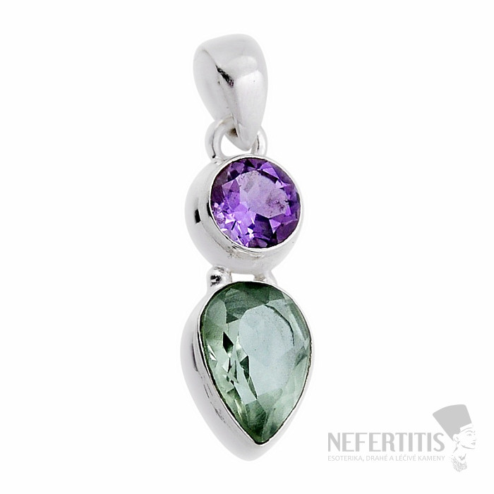 Einzigartiger Anhänger mit geschliffenem grünem Amethyst – Prasiolith und violettem Amethyst. Lassen Sie sich von der zarten und vor allem ungewöhnlichen grünen Farbe des Amethysts verzaubern. Dieses einzigartige Schmuckstück besticht durch seine außergewöhnliche Amethystfarbe. Das Grün des Steins macht diesen Anhänger zu einem seltenen und begehrten Schmuckstück. Grüner Amethyst kommt in der Natur nicht vor; wie die meisten Citrine auf dem Markt wird er durch die Behandlung von Amethystkristallen hergestellt. Dieser Stein wurde um 1950 in Amerika auf den Markt gebracht und erhielt dort den Namen Prasiolith, eine Kombination der griechischen Wörter für Schnittlauchgrün und Stein. Grüne Amethyste stammen hauptsächlich aus Brasilien , aus bekannten Amethyst-Fundgebieten wie Minas Gerais und Rio Grande do Sul. Silber 925. Sie erwerben das abgebildete Schmuckstück.