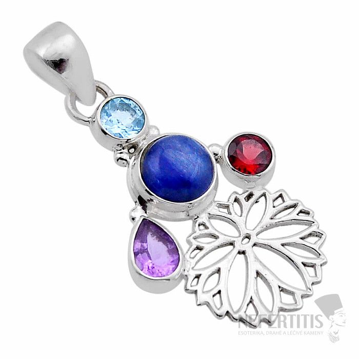 Schöner Silberanhänger mit einem Cabochon aus wunderschön gefärbtem Kyanit und mit geschliffenem Amethyst, Granat und Topas. Ag 925. Sie erwerben hier direkt den abgebildeten Schmuck.