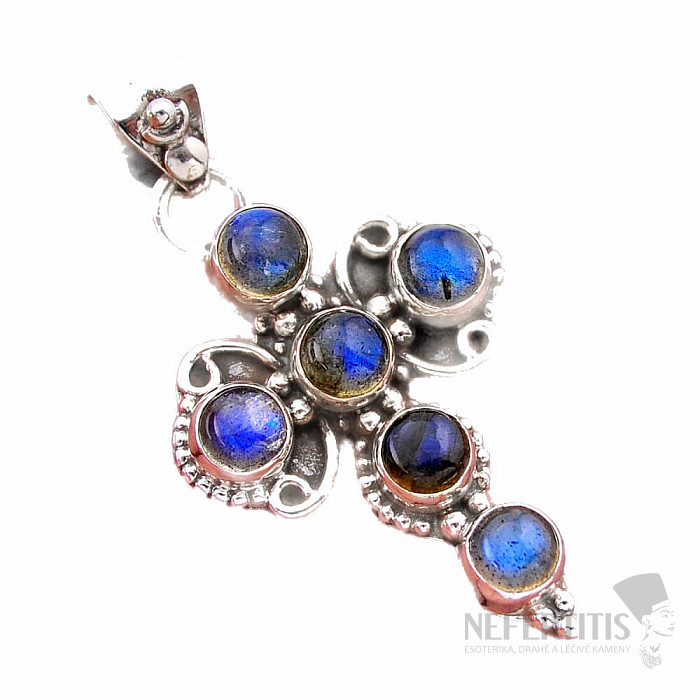 Ein bezaubernder und außergewöhnlicher Silberanhänger in Kreuzform mit erstklassigem natürlichem Labradorit, mit einem unverwechselbaren Regenbogen-Farbspiel, bei dem die leuchtend blau-goldene Farbe bei Lichteinfall magisch leuchtet. Ag 925. Lassen Sie sich von der Schönheit und dem Spiel seiner leuchtend blauen Farbe verzaubern. Dank des Farbspiels ist es ein attraktives und unübersehbares Schmuckstück. Sie erwerben direkt das abgebildete Schmuckstück.