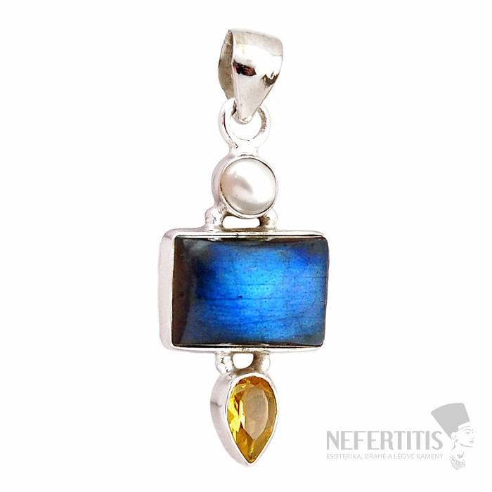 Ein bezaubernder und außergewöhnlicher Silberanhänger mit erstklassigem , natürlichem Labradorit , dessen leuchtend blau-goldene Farbe im Licht magisch schimmert. Der Anhänger ist mit einer weißen Perle und einem geschliffenen Citrin verziert. Silber 925. Lassen Sie sich von der Schönheit und dem faszinierenden Farbenspiel des Labradorits verzaubern. Dank dieses einzigartigen Farbspiels ist dieses Schmuckstück ein absolutes Must-have. Sie erwerben genau das abgebildete Schmuckstück.