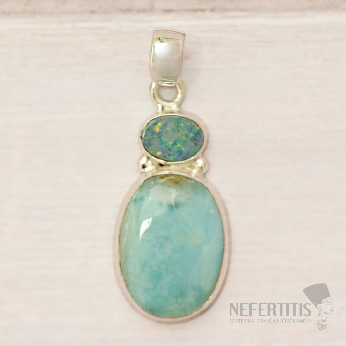 Ein bezaubernder Anhänger aus Silber mit einem wunderschönen und hochwertigen Cabochon aus seltenem Larimar, der dem Spiel des Sonnenlichts auf der Meeresoberfläche ähnelt, und einem Doublet aus australischem Opal . Der Schmuck ist handgefertigt, der Larimar wird sorgfältig mit einer ausgeprägten blauen Farbe ausgewählt. Ag 925. Sie erwerben direkt den abgebildeten Schmuck.