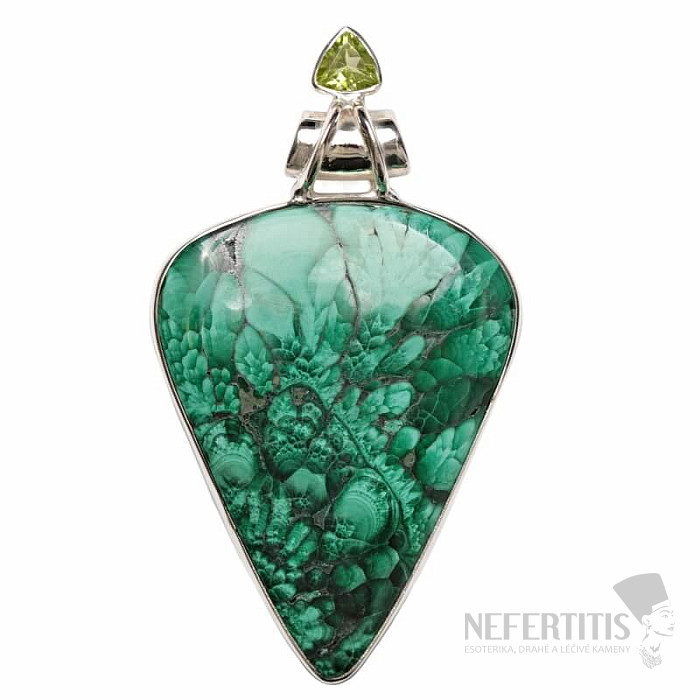 Silberanhänger mit Malachit , dessen tiefgrüne Farbe und einzigartiges Design jeden verzaubern werden, und geschliffenem Olivin. Silber 925. Sie erwerben das abgebildete Schmuckstück.