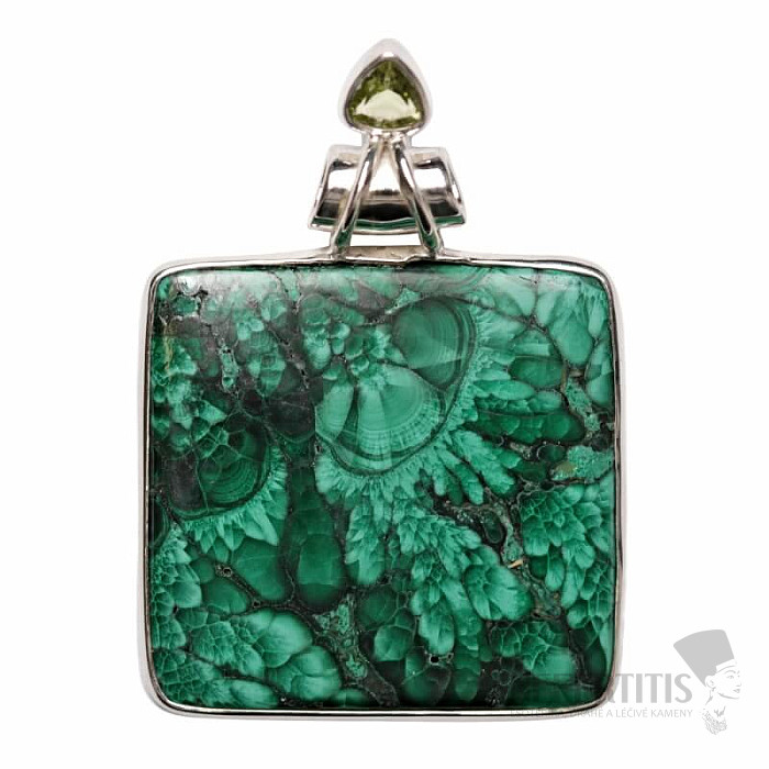 Silberanhänger mit Malachit , dessen tiefgrüne Farbe und einzigartiges Design jeden verzaubern werden, und geschliffenem Olivin. Silber 925. Sie erwerben das abgebildete Schmuckstück.