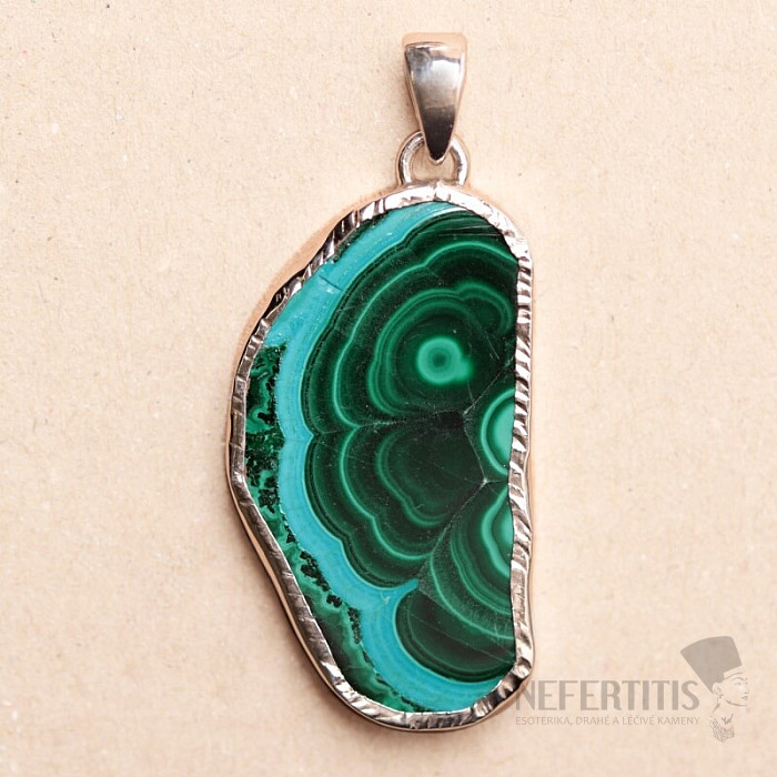 Ein wunderschöner Silberanhänger mit einer polierten, zauberhaft gefärbten Chrysokollscheibe mit Malachit wird Sie auf den ersten Blick durch sein Muster und die Schönheit seiner Farben bezaubern. Ein einzigartiges Schmuckstück, das im Handel nicht allzu häufig zu finden ist. Ein sehr dekorativer und attraktiver Anhänger, auch dank der Größe der Scheibe. Ag 925. Limitiertes Angebot von nur wenigen Exemplaren. Sie kaufen das abgebildete Schmuckstück.
