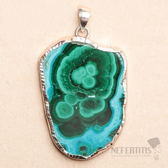 Ein wunderschöner Silberanhänger mit einer polierten, zauberhaft gefärbten Chrysokollscheibe mit Malachit wird Sie auf den ersten Blick durch sein Muster und die Schönheit seiner Farben bezaubern. Ein einzigartiges Schmuckstück, das im Handel nicht allzu häufig zu finden ist. Ein sehr dekorativer und attraktiver Anhänger, auch dank der Größe der Scheibe. Ag 925. Limitiertes Angebot von nur wenigen Exemplaren. Sie kaufen das abgebildete Schmuckstück.