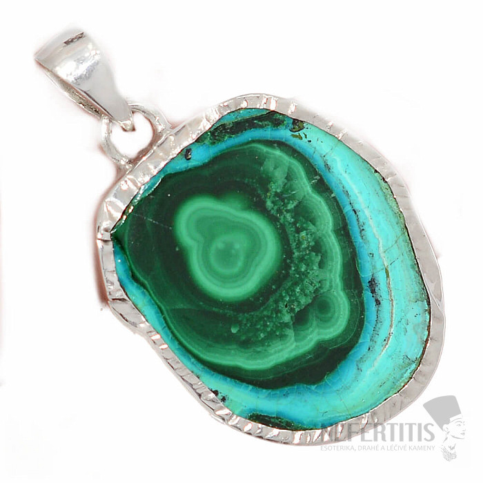 Ein wunderschöner Silberanhänger mit einer polierten, magisch gefärbten Chrysokollscheibe mit Malachit wird Sie auf den ersten Blick mit seinem Muster und der Schönheit seiner Farben verzaubern. Ein einzigartiges Schmuckstück, das im Handel nur selten zu finden ist. Ein sehr dekorativer und attraktiver Anhänger, auch dank der Größe der Scheibe. Silber 925. Limitiertes Angebot – nur wenige Exemplare verfügbar. Sie erwerben den abgebildeten Schmuck.