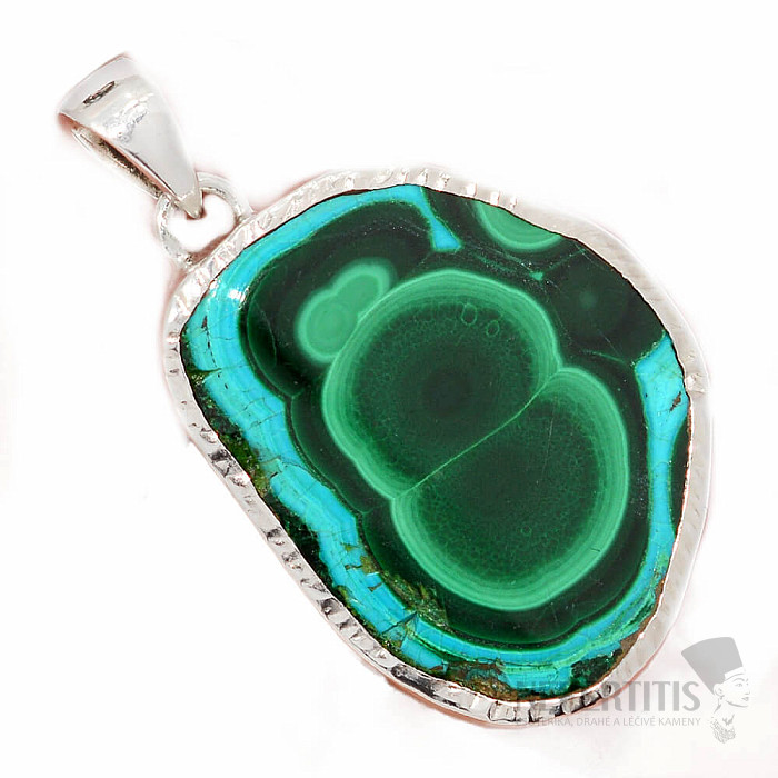 Ein wunderschöner Silberanhänger mit einer polierten, magisch gefärbten Chrysokollscheibe mit Malachit wird Sie auf den ersten Blick mit seinem Muster und der Schönheit seiner Farben verzaubern. Ein einzigartiges Schmuckstück, das im Handel nur selten zu finden ist. Ein sehr dekorativer und attraktiver Anhänger, auch dank der Größe der Scheibe. Silber 925. Limitiertes Angebot – nur wenige Exemplare verfügbar. Sie erwerben den abgebildeten Schmuck.