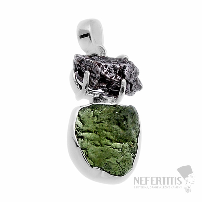 Silberanhänger mit Moldavit und Meteorit Campo del Cielo. Silber 925. Moldavit gilt als Glücksbringer. Sie erwerben genau das abgebildete Schmuckstück.