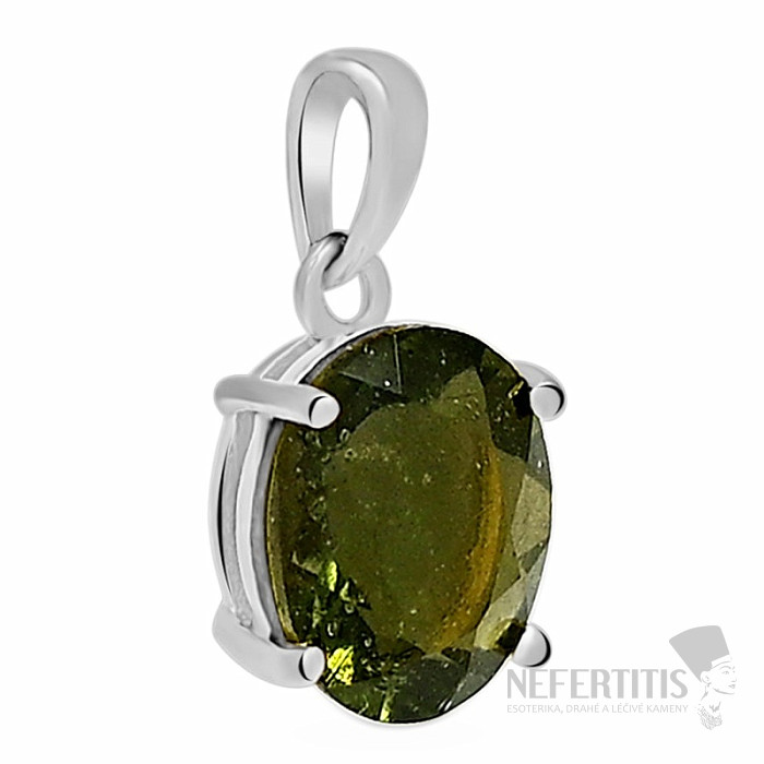 Silberanhänger mit geschliffener Moldavite. Ag 925. Vltavín gilt als Glücksbringer. Illustratives Bild, die Farbe des erhaltenen Steins kann leicht vom Foto abweichen.